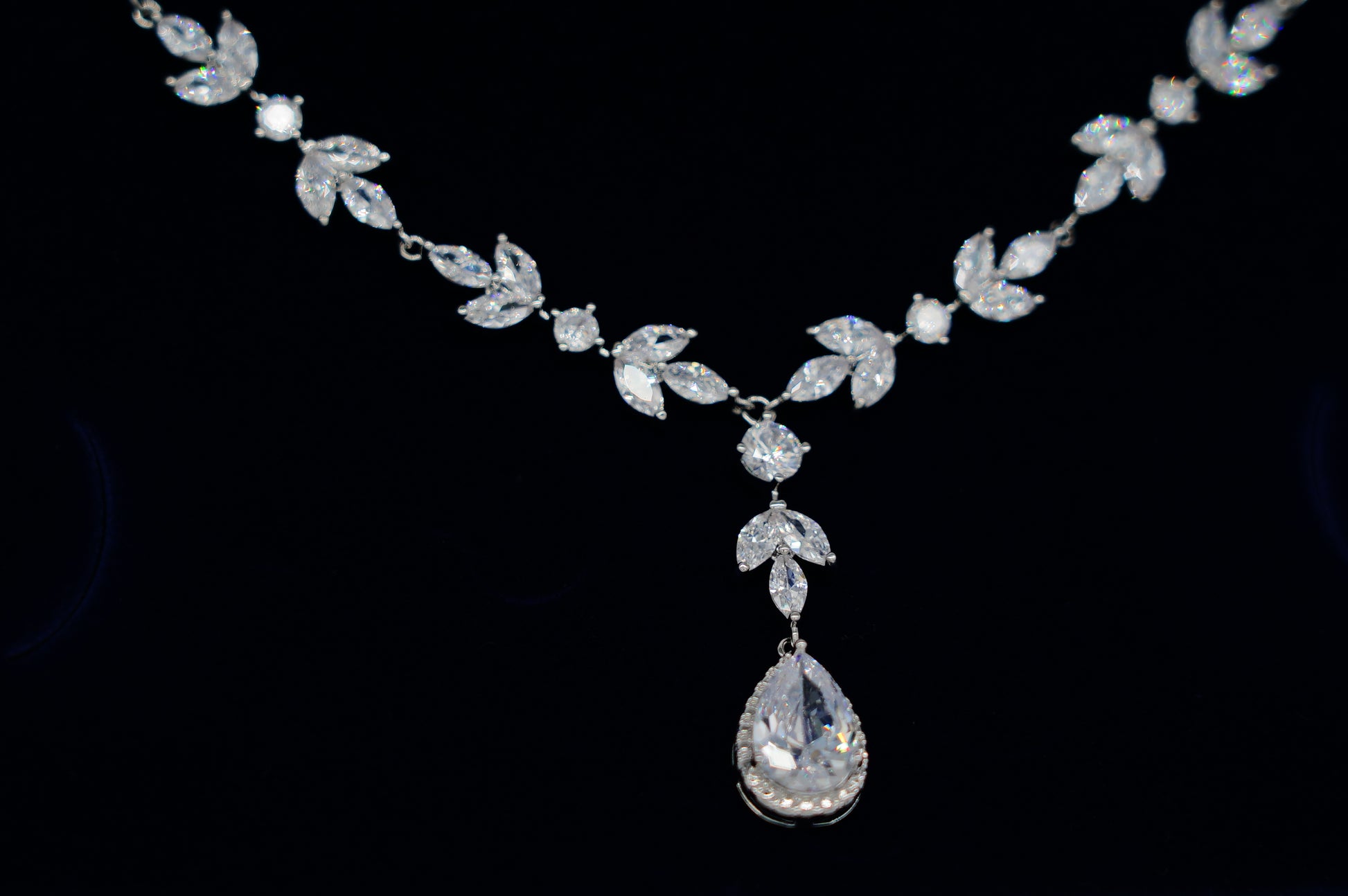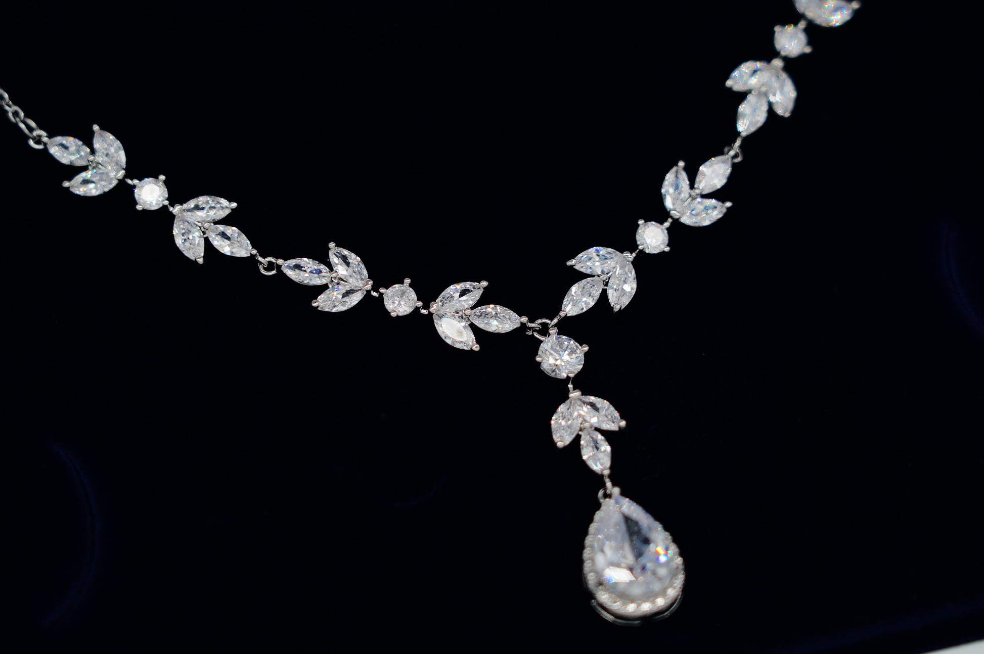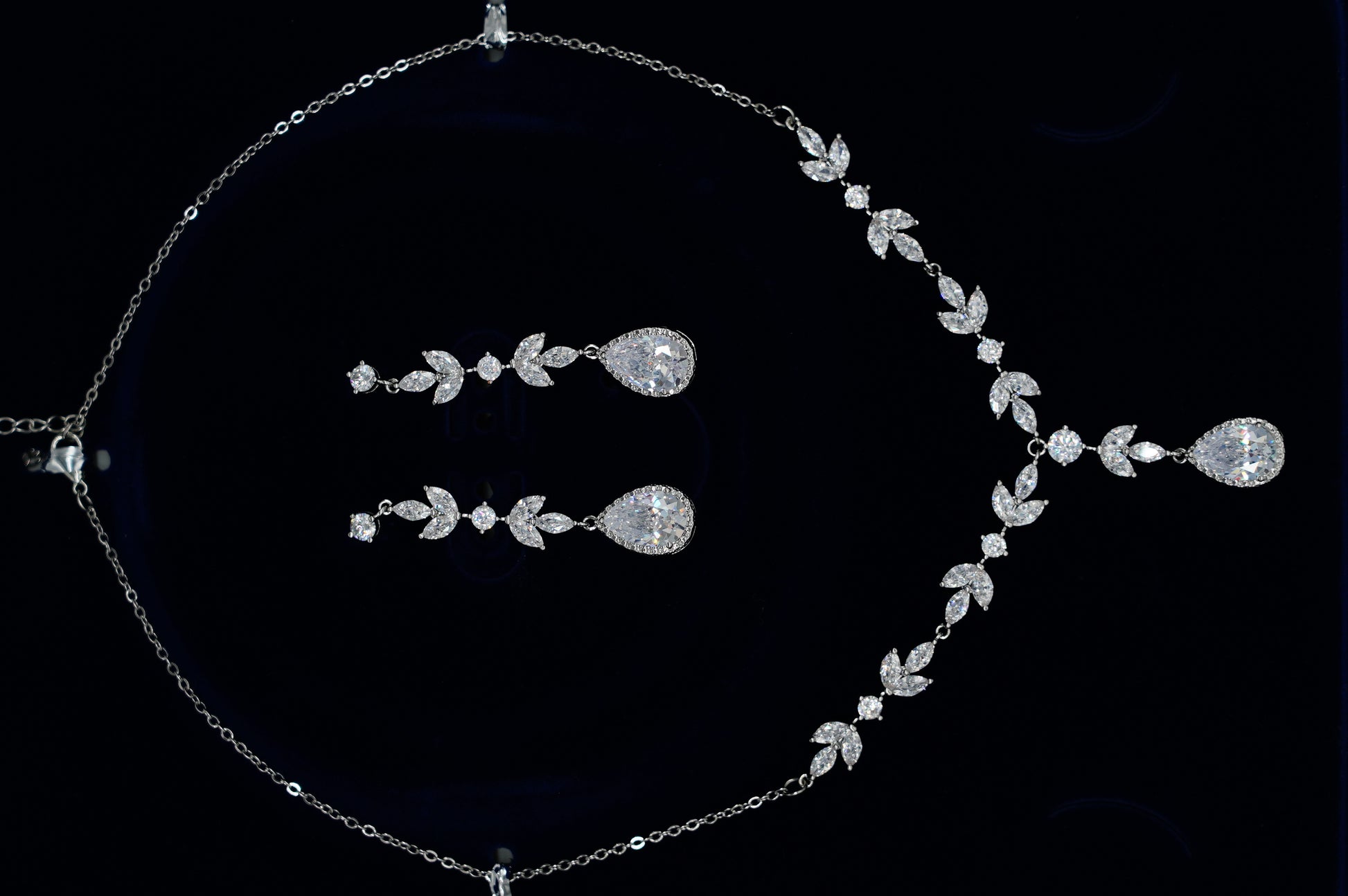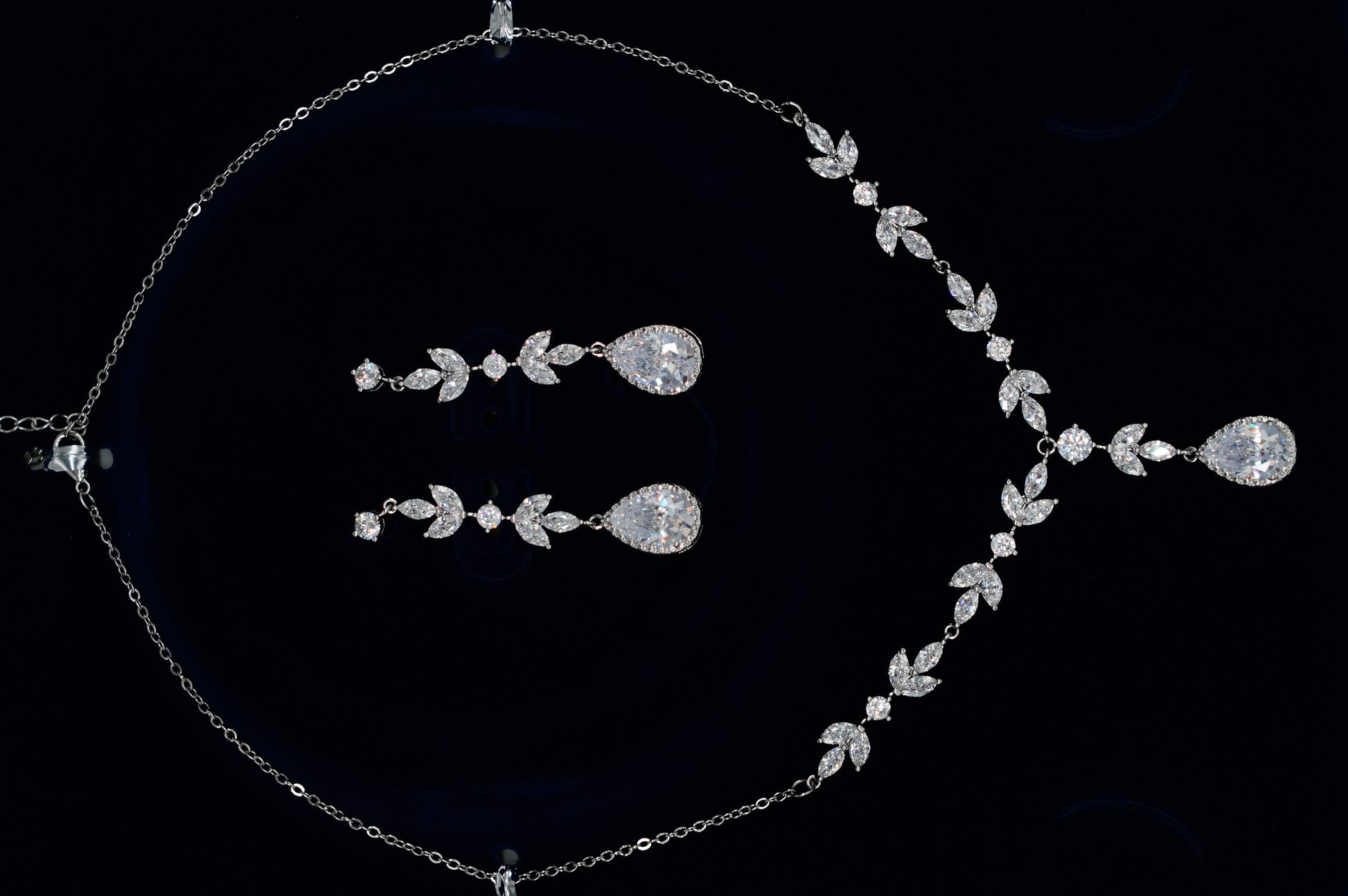 This elegant jewelry set features a silver-tone necklace designed with a continuous crystal floral pattern, paired with matching drop earrings for a soft and romantic look.